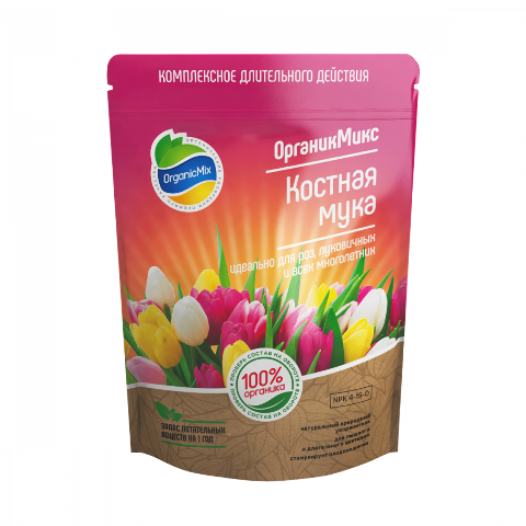 Удобрение ОрганикМикс Костная мука (NPK: 4-15-0) - специально подготовленная для растений костная мука для применения в качестве органического источника фосфора и азота. При внесении в почву, растение получает энергию для формирования мощной разветвленной корневой системы и образования крупных бутонов, соцветий и плодов. Также применяется при пересадке саженцев для быстрого укоренения и развития корневой системы. Стимулирует развитие корневой системы. Увеличивает урожайность. Улучшает приживаемость саженцев и рассады. Восстанавливает плордородие почвы. Пролонгированный эффект.