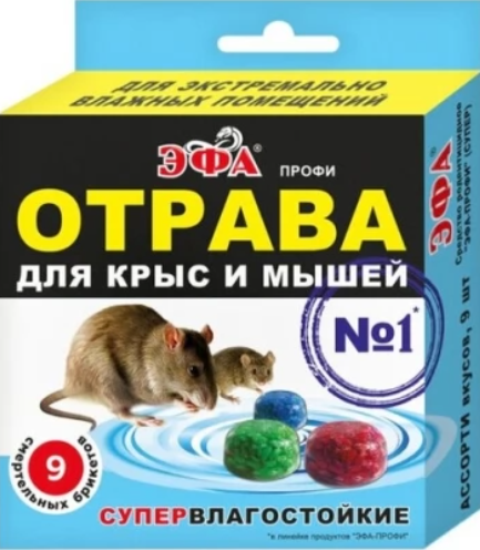 Эфа-профи Супер – это готовая к использованию приманка для уничтожения грызунов. Она представлена в виде ярких парафиновых брикетов, каждый со своим вкусом: красные – зерновые, синие – рыбные, зеленые – пивные. Эти влагостойкие брикеты предназначены для борьбы с крысами, мышами и другими вредителями. Средство можно применять как в жилых и производственных помещениях, так и на прилегающих территориях, включая свалки и сады. Гибель грызунов наступает через 4-11 дней после употребления смертельной дозы, которую они могут получить за 1-2 дня. Основной действующий компонент – бромадиолон (0,005%), в составе также присутствуют пищевые компоненты и парафин.