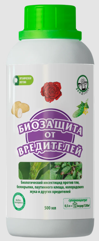 Биозащита от вредителей® - биологический инсектицид избирательного действия для уничтожения вредителей в период вегетации: колорадский жук и его личинки, клещи, белокрылки, гусеницы чешуекрылых насекомых-вредителей (бабочка- капустница, капустная, яблоневая и плодовая моль, капустная совка, бабочки, огневки, листовертки, шелкопряды, златогузки, пильщики, тли и др.) на овощных, цветочных, сельскохозяйственных, плодово-ягодных и декоративных культурах. Биопрепарат применяют для борьбы с личинками разных возрастов и имаго вредителей.