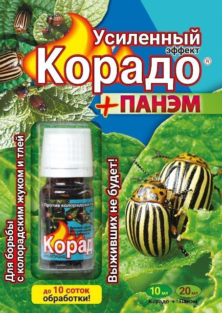 Корадо + Панэм Усиленный эффект - системный препарат, защищает даже молодой прирост, растущий после опрыскивания. Эффективен и против личинок, и против взрослых жуков. Усиленный эффект достигается благодаря специальному прилипателю Панэм. Более прочный контакт с листьями и покровами вредителей, большее и лучшее проникновение действующего вещества в организм насекомых и листовые пластины, меньше потерь препарата из-за стекания с листьев и испарения в жаркую погоду. После опрыскивания защищает картофель и другие культуры длительное время, в т. ч. за счет меньшего смывания дождем и росой.