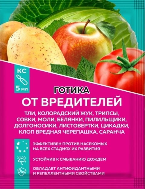 Готика – это мощный инсектицид, который быстро и эффективно уничтожает вредителей, контактирующих с обработанными растениями. Он борется с широким спектром насекомых, включая тлю, колорадского жука, трипсов, совок, моль, белянок, пилильщиков, долгоносиков, листоверток, цикадок, клопов вредной черепашки, саранчу и многих других. Препарат подходит для защиты картофеля, зерновых, овощных и плодовых культур.