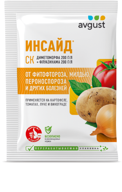 В средстве используется сразу 2 действующих вещества – эффективность выше однокомпонентных фунгицидов, а риск возникновения устойчивости у патогенных микроорганизмов сведен к минимуму. Препарат устойчив к смыванию дождем и защищает культуры до 2 недель после обработки. Фунгицид подходит как для профилактических, так и для лечебных опрыскиваний. Действующие вещества быстро подавляют прорастание спор и останавливают развитие инфекции. Инсайд подойдет для обработки картофеля от фитофтороза, репчатого лука от пероноспороза, винограда от милдью и черной пятнистости.