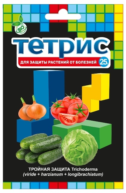 Состав Тетрис СП: титр не менее 4х106 КОЕ/г Trichoderma viride Е 2001 + не менее 3х106 КОЕ/г Trichoderma harzianum F 2009 + не менее 3х106 КОЕ/г Trichoderma longibrachiatum Е 2124.