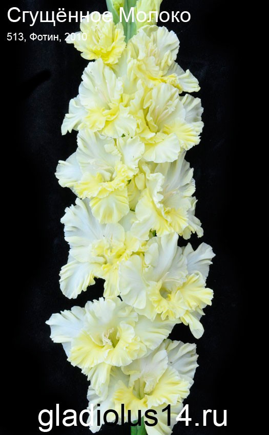 Описание: Высота 160 см. Соцветие 80 см, 23 бутона (9 одновременно открыто). Бутон 14,5 см. Светло кремово-лимонный цветок. Три нижних лепестка ярко-лимонные. Сильно гофрирован защипами и складками по краям лепестков. Края рваные (бахромчатые).