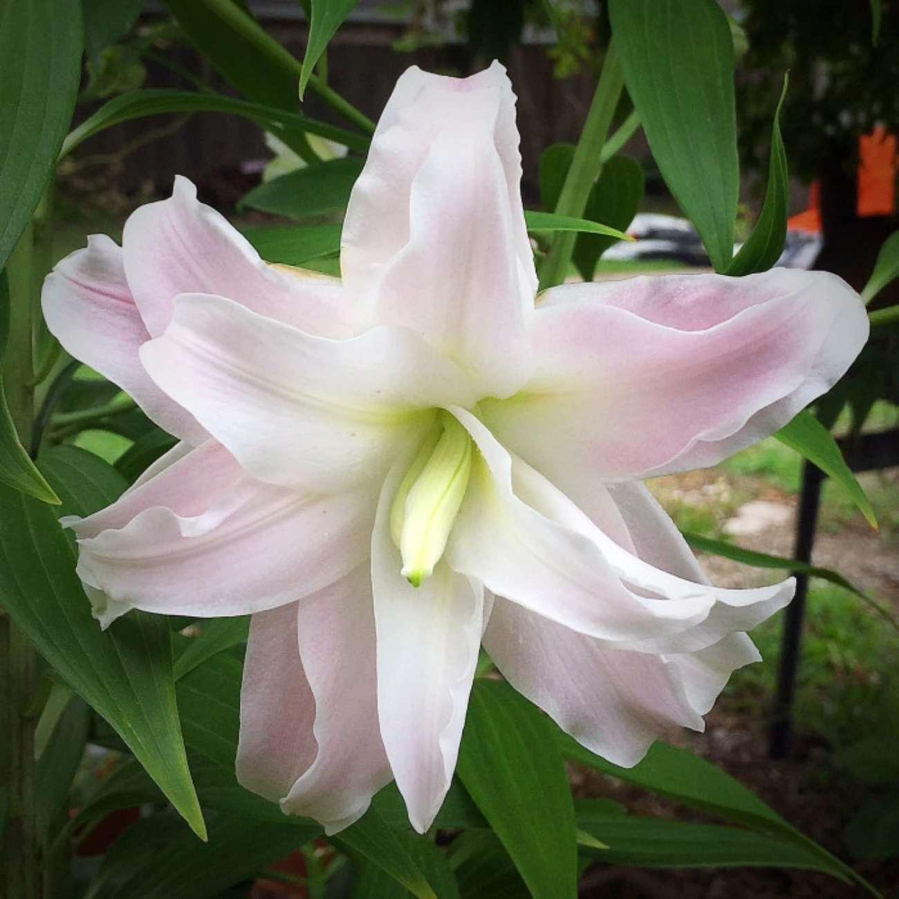 Цветы махровые, крупные, диаметром до 20 см, лепестки нежно-розовые, тычинок нет. На одном цветоносе размещается несколько цветов. Цветёт в период с июля до августа. Высота растения - 85 см.