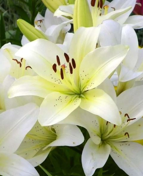 Цветы крупные, белоснежного окраса с кремовой серединой, по направлению смотрят вверх. Источает нежный, приятный аромат. Высота растения - 60 см, диаметр цветка - 10-15 см.