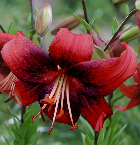 Цветок с окрасом лепестков насыщенного теплого красного оттенка с более темным напылением у горла. Не имеет запаха. Высота растения - 110 см, диаметр цветка - 15-17 см.