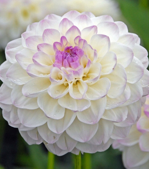 Махровый цветок георгины Эвелин достинает диаметра 12-15 см и отличается необычайной красотой и утонченностью. Молочно-белые лепестки окрашены в нежно сиренево - лиловый оттенок по краям, что придаёт цветкам особую элегантность и шарм. Такие цветки станут ярким акцентом в любом цветочном ансамбле, привлекая внимание и восхищение. Высота растения 80-100 см. Сорт отлично смотрится в срезке. Цветение продолжительное (июль - сентябрь).