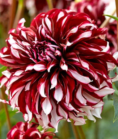 Лепестки георгины Икс Фактор слегка изогнуты, придают эффект легкой махровости. Бордовые лепестки с белыми кончиками формируют пышную махровую форму соцветия, которая потрясающе смотрится на солнечных клумбах или в патио-посадках. На солнце цвет смотрится ярким рубиново-красным оттенком! Очень интересный вариант для точечных акцентов в цветниках и крупных миксбордерах. Диаметр цветка георгины 18-20 см. Особенно красиво георгина Икс Фактор будет смотреться на фоне темно-зеленых кустарников!