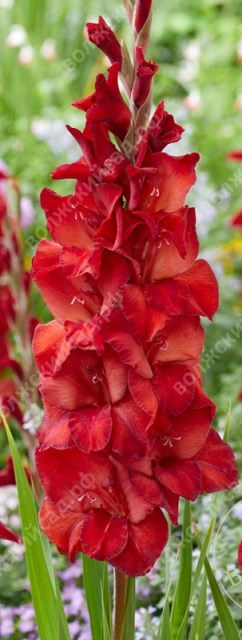 Цветок ало-красный, более светлеет к центру. На некоторых лепестках есть продольная белая полоса, делящая лепесток пополам. Высота - 80-100 см.