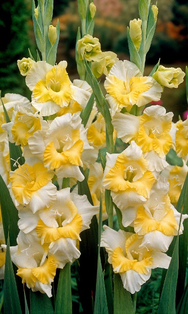 Гладиолус Багги - многолетнее клубнелуковичное растение семейства Ирисовых. Высота 100-120см. Размер цветка до 15см. Гофрированный, двухцветный: внешние лепестки белые, внутренние лепестки желтые. Цветение июль-август.