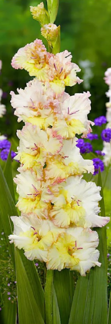 Цветок бело-кремовый, на некоторых лепестках присутствует желтый оттенок. По краю лепестков нежно розовый кант. Сильно гофрированный. Высота растения - 110 см.