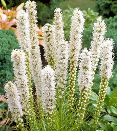 В народе лиатрис еще называют “веселые перышки”. Растение высотой 60 см и более. Цветет белоснежными пушистыми колосками, расцветающими постепенно, сверху вниз. Имеет тонкий аромат, слегка напоминающий запах ванили. Является медоносным растением. Совершенно неприхотливый сорт, под слоем снега может зимовать без укрытия.