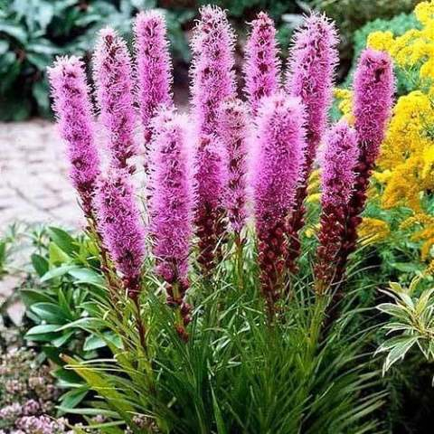 В народе лиатрис еще называют “веселые перышки”. Растение высотой 60 см и более. Цветет светло-сиреневыми пушистыми колосками, расцветающими постепенно, сверху вниз в июле. Имеет тонкий аромат, слегка напоминающий запах ванили. Является медоносным растением. Совершенно неприхотливый сорт, под слоем снега может зимовать без укрытия.