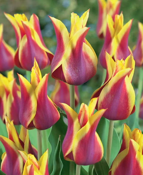 Лилиецветный сорт. Период цветения в апреле - мае. Цветы имеют двухцветную окраску: темные красные-коричневые у основания лепестки к краям приобретают огненно-желтый оттенок. Высота 50-60 см.