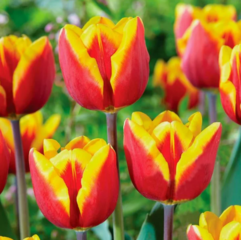 Тюльпан сорта Рене Дрейк из класса Триумф поражает своей красотой. Его изящные, заостренные бутоны насыщенного красного цвета обрамлены эффектной широкой желтой каймой. Этот двухцветный красавец достигает 60 см в высоту и отличается высокой устойчивостью к погодным условиям, а также превосходно смотрится в букетах.