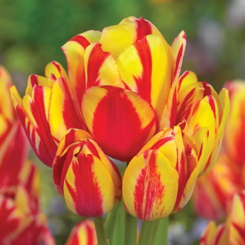 Многоцветковый тюльпан с необычной окраской: желтый с ярко-красными всполохами. Из стебля появляется сразу несколько цветоносов (может быть 5-7 шт.). Расположенные по бокам цветки отличаются по размеру и форме от центрального, что придает растению еще большую пышность и оригинальность красок. Тюльпан может удивлять сросшимися цветоносами. Идеально подходит для ландшафтного дизайна. Высота 40 см.