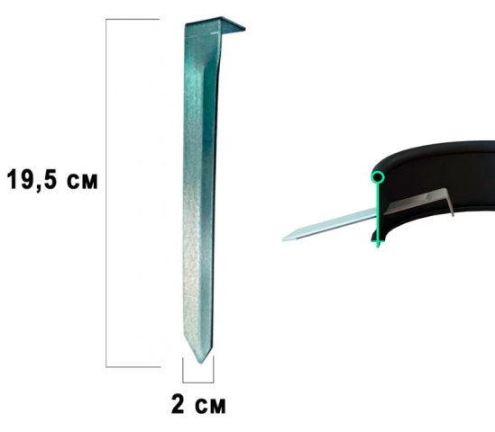 Колышек применяется для крепления бордюра и бордюрной ленты в грунте. Колышек сделан из оцинкованной стали, это исключает ржавчину и окисление почвы. Для предотвращения выдавливания из земли рекомендуется использовать 8-10 шт. на 10 метров бордюра. Полотно бордюра или бордюрной ленты пробивается острым наконечником колышка. Длина колышка 19,5 см.