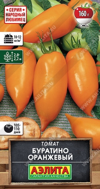 Раннеспелый сорт для пленочных укрытий и открытого грунта. Формирует урожай через 105-110 дней от всходов. Индетерминантный, высотой в теплице до 2-2,2 м. На стадии рассады у томата скручиваются листья – это сортовой признак. Плоды* вытянутой цилиндрической формы, с носиком, очень красивые, средней массой 140-160 гр. (отдельные до 180 гр.). В кисти формируется до 4-6 томатов, которые висят гроздьями. Мякоть вкусная, сочная и очень плотная. Плоды сначала светло-зеленые, затем, по мере созревания, кожица их обретает ярко-оранжевый цвет. Сорт с высоким содержанием бета-каротина и ликопина, не вызывает аллергию. Использование универсальное. Урожайность в теплице 10-12 кг/м2.
