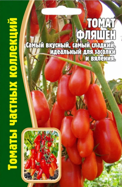 Среднеспелый (110-120 дней), индерминантный, высокоурожайный, кистевой сорт для теплиц и открытого грунта. С одного растения можно получить до 6-7 кг помидоров и даже более.Плоды небольшие , в среднем вес от 40 до 80 грамм. Вкус сбалансированый, сладкий, без кислинки. Мякоть плотная, сочная, семян мало. Кожица не толстая, глянцевая, при цельноплодном консервировании плоды не трескаются. Томаты Фляшен очень хорошо хранятся, дозревают в помещении и выносят любую транспортировку. Если снять последние кисти в теплице в начале октября, то вполне возможно лакомится плодами до нового года. Достоинства сорта: сверхвысокая рекордная урожайность; длительное плодоношение, вплоть до заморозков; устойчивость к фитофторозу и сравнительная неприхотливость в выращивании; сладкий, насыщенный вкус помидоров.