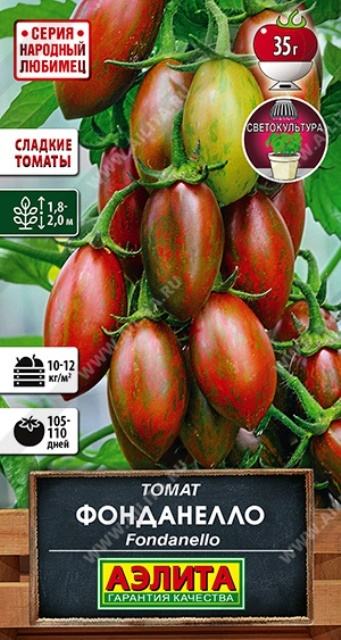 Очень сладкие томаты! Фонданелло становится фаворитом у всех, кто хоть раз его выращивали пробовал! Бесподобный сладкий вкус, оригинальная окраска и форма плодов – все это делает сорт поистине уникальным. Раннеспелый, от всходов до начала уборки 105-110 дней. Растения индетерминантные, высотой 1,8-2 м. Томаты* массой 30-35 гр., собраны в кисти по 8-13 штук. Мякоть плодов глубокого красного, почти бордового цвета. Изумительный вкус плодов определяется высоким содержанием суммы сахаров, которая очень характерна для сортотипа Черри. Томаты сорта Фонданелло превосходно подходят для салатов, закусок и консервирования.