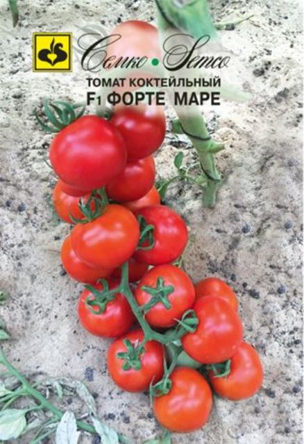 Томат Форте Маре F1 - ранний, индетерминантный коктейльный кистевой гибрид LSL-типа. От всходов до созревания плодов 90–95 дней. Растение среднеоблиственное. Формируют в один стебель. Первое соцветие формируется над 7–9 листом, последующие через 3 листа. В кисти, в среднем, завязывается 8–10 плодов. Плоды округлой формы, темно-красной окраски, двухкамерные, массой 40–60 гр., плотные, гладкие. Собирают как кистями, так и отдельными плодами. Вкусовые и товарные качества помидоров отличные, сохраняются без их изменения в течение 40–45 дней. Гибрид устойчив к вирусу томатной мозаики (ToMV). Транспортабельность и лежкость хорошие. Используется для потребления в свежем виде и цельноплодного консервирования. Рекомендуется для выращивания во всех типах теплиц и в открытом грунте с подвязкой к опоре. Схема посадки 70х40 см. Урожайность свыше 14–15 кг/м2.