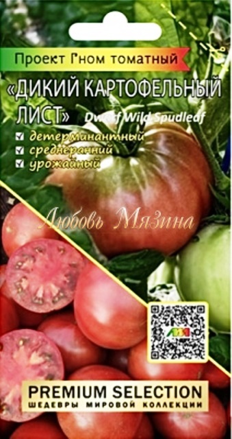 Томат Гном Дикий картофельный лист (Dwarf Wild Spudleaf) - среднеспелый, готов к сбору урожая через 105-115 дней. Растение детерминантного, штамбового типа, достигает 80-100 см в высоту. Листья крупные, морщинистые, цельные. Плоды формируются отлично, имеют плоскоокруглую форму, весят от 150 до 350 гр., окрашены в красно-коричневый цвет. Мякоть плотная, сочная, с гармоничным вкусом. Сорт идеален как для употребления в свежем виде и для консервирования. Сорт обладает относительной устойчивостью к болезням. Посев рекомендуется проводить в первой половине марта.