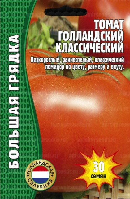 Замечательный сорт голландской селекции порадует вас красивыми, ровными плодами массой 150-250 гр. Раннеспелый (90-100 дней), детерминантный (40-60 см), высокоурожайный сорт для открытого грунта и пленочных укрытий. Томат Голландский классический имеет длительный период плодоношения и обладает отличным томатным вкусом как в свежем виде, так и при всех видах переработки. Это классический помидор по цвету, размеру и вкусу.