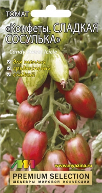 Томат Конфеты Сладкая сосулька (Candy Sweet Icicle) – американский сорт для теплиц и для открытого грунта на юге. Сорт среднеспелый, индетерминантный, приятноудивит красотой, отменным вкусом, высокой урожайностью и дружным созреванием плодов. Плоды удлиненные, с изящным острым кончиком, имеют две камеры и весят около 50 грамм. В зрелом виде плоды приобретают яркий, глянцевый красный цвет с эффектными желтыми полосками, сладкий вкус, с выраженным фруктовым ароматом и едва уловимой приятной кислинкой. Рекомендуется для употребления в свежем виде, для консервирования и вяления. Рекомендуется пасынковать и формировать растение в 2-3 стебля с обязательной подвязкой.