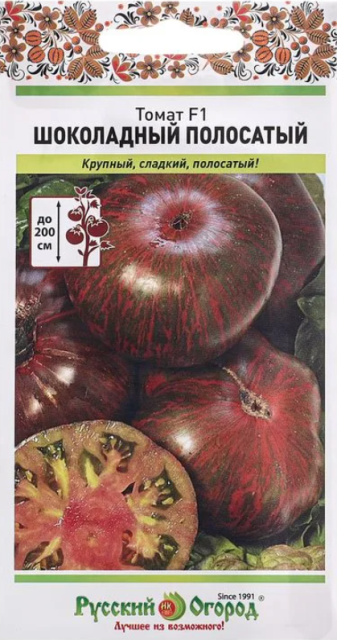 Очень вкусный, сочный, с необычной яркой коричневой с зелеными полосками окраской биф-томат станет украшением как вашего огорода, так и желанным гостем на столе. Гибрид индетерминантный, растения достигают в высоту 1,5-2 м, среднеспелый, урожайный (при правильном уходе можно собрать до 10 кг с 1 квадратного метра). Плоды массой 250-500 гр., плотные, мясистые, сладковатые с мощным характерным томатным вкусом и запахом. Рекомендуется для употребления в свежем виде.