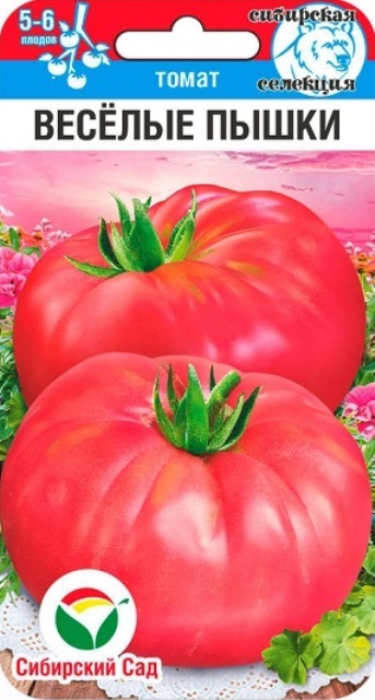 Томат Веселые пышки - раннеспелый (100-105 дней) сорт с обильным урожаем вкуснейших розово-малиновых томатов. Плоды, весом 150-250 гр., имеют привлекательную плоско-округлую форму и гладкую кожицу, превосходны как для употребления в свежем виде, так и для бочкового засола. Сорт отличается высокой завязываемостью и стабильной урожайностью, проверенной в суровых сибирских условиях, плодоносит до самых заморозков. Куст детерминантного типа, высотой 1,0-1,7 м, с редкой листвой, формирует красивые кисти по 5-6 плодов. Мякоть плодов розовая, с минимумом семян и прекрасным вкусом, идеальна для салатов, соков, соусов, пюре и крупноплодного засола. Сорт обладает хорошей устойчивостью к основным болезням культуры. Урожайность высокая.