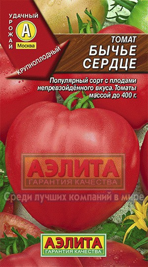 Популярный, высокоурожайный среднеспелый сорт, период отвсходов до созревания 115-120 дней. Предназначен для выращивания в открытом грунте и под пленочными укрытиями. Урожайность высокая, 8-12 кг/ м2. Растения детерминантные, сильнорослые, высотой до 170 см. Плоды очень крупные, массой 110-250 г, при первом сборе до 400 г, сердцевидной формы, мясистые, с тонкой кожицей. Вкус классический “помидорный” – сладкий, с чуть заметной кислинкой. Один из лучших сортов для употребления в свежем виде и приготовления соков.