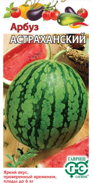 Арбуз Астраханский - среднеспелый сорт созревает за 70-81 день после появления всходов. Подходит для выращивания как в пленочных теплицах, так и в открытом грунте, особенно в южных областях. Растения формируют среднерослые плети с сизо-зелеными, умеренно рассеченными листьями. Плоды имеют округлую или удлиненно-округлую форму, гладкую или слегка сегментированную поверхность с темно-зелеными полосами на сетчатом фоне. Кора у плодов средней толщины, светло-зеленая и кожистая. Мякоть красная, плотная, сладкая и очень вкусная. Отдельные плоды могут достигать веса до 5,6 кг. Сорт обладает устойчивостью к антракнозу.