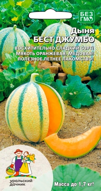 Дыня Бест джумбо поражает своей восхитительной сладостью и насыщенным ароматом. Мякоть, окрашенная в яркий оранжевый цвет благодаря высокому содержанию бета-каротина, обладает нежной, тающей текстурой и медовым послевкусием. Среднеспелый сорт, готов к сбору урожая через 90-100 дней после появления всходов. Плоды весом 1,5-1,7 кг имеют тонкую кожицу, что делает их удобными в употреблении. Дыня Бест джумбо – настоящее летнее удовольствие, полезное как для детей, так и для взрослых. Сорт прекрасно подходит для приготовления цукатов, варенья и повидла. Сорт отличается устойчивостью к болезням и хорошей транспортабельностью.