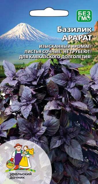 Базилик Арарат созревает в средние сроки. От появления первых ростков до появления цветов проходит примерно 55-60 дней. Растение растет вверх, ветвится не сильно, достигая высоты до 60 см. С одного куста можно собрать от 25 до 35 граммов зелени. Листья растут на черешках, имеют средний размер и форму широкого яйца с редкими зубчиками по краям. Цвет листьев синевато-зеленый, с небольшим фиолетовым оттенком. Цветки сиреневые. Главное достоинство сорта - насыщенный аромат. Листья и молодые побеги можно использовать свежими или сушеными в качестве приправы, а также для маринования и соления.