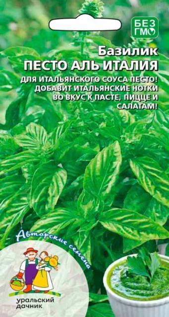 Базилик Песто Аль Италия раннеспелый сорт, обладающий уникальным ароматом, напоминающим гвоздику. Сорт находит широкое применение как в кулинарии в качестве пряной добавки, так и в медицинских целях. Период от появления всходов до сбора урожая составляет всего 24-43 дня. Растение формирует компактный, прямостоячий куст высотой 30-40 см, обильно покрытый крупными, ярко-зелеными листьями. Цветки белые. Средний вес одного растения колеблется от 140 до 280 гр., урожайность зеленой массы достигает 1-2,4 кг с кв.м. Интенсивность аромата варьируется от умеренной до сильной, что связано с содержанием в эфирных маслах таких компонентов, как метилхавикол, цинеол, линалоол, оцимен и камфора.