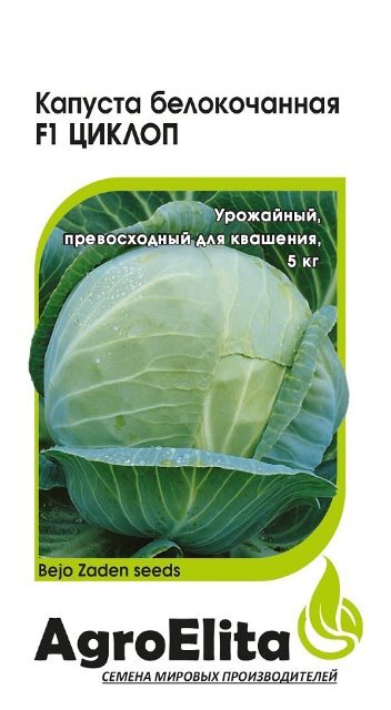 Капуста б/к Циклоп F1 - непревзойденный гибрид для квашения от японской компании Саката. Среднеспелый. Созревает через 85-90 дней после высадки рассады. Кочан компактный, круглый, плотный, с короткой внутренней кочерыгой и тонкими листьями, массой 3,0-5,0 кг. Наружная окраска кочанов зеленая, на разрезе — беловатая. Повышенное содержание сухих веществ в листьях, благотворно влияет на вкус квашеной капусты, большое количество аскорбиновой кислоты сохраняет белоснежный цвет, а плотная внутренняя структура кочана, позволяет получить при шинковке более длинные упругие волокна. Гибрид обладает высокой устойчивостью к фузариозному увяданию. Рекомендуется для квашения и употребления в свежем виде.