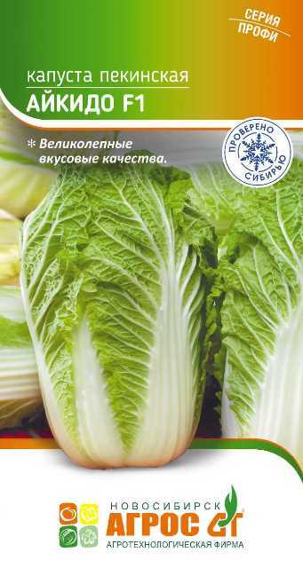 Капуста пекинская Айкидо F1 - среднеспелый гибрид. Формирует полупрямостоячие розетки листьев. Кочаны достигают массы около 2 кг, имеют яйцевидную форму и среднюю плотность, полуоткрытые, на срезе видны желтые внутренние листья. Листья среднего размера, обратнояйцевидные, зеленого цвета, с характерной пузырчатостью и легким опушением. Жилки вогнутые, у основания широкие, белые. Идеально подходит для употребления в свежем виде и кратковременного хранения.