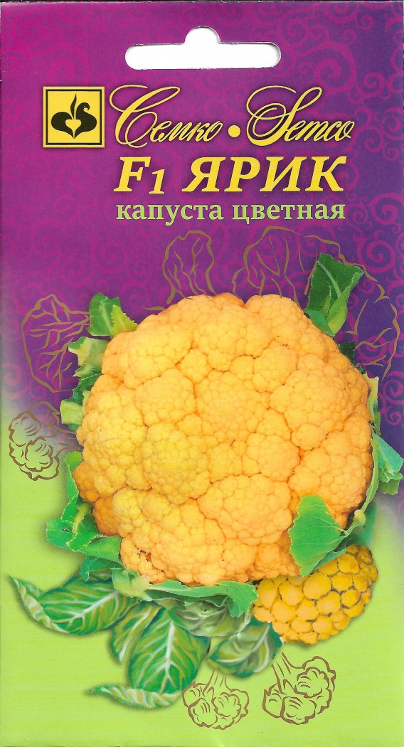 Цветная капуста Ярик F1 - среднеспелый гибрид с оранжевой окраской головки. От высадки 35-дневной рассады до уборки 60–65 дней. Растение полупрямостоячее, листья зеленые. Головка округлая, плотная, мелкобугристая, хорошо покрытая, с нежной структурой, желто-оранжевой окраски, массой 300–500 г. Вкусовые качества свежей и переработанной продукции отличные. Уникальность цветной капусты Ярик F1 в оранжевой окраске головки, повышенном содержании бета-каротина, витамина А, возможность использования ее как в свежем виде в салатах, так и в домашней кулинарии. Для раннего потребления посев на рассаду проводят в середине марта с высадкой в мае под пленку, для летнего использования – посев в середине мая, для позднего – с конца июня до начала июля. Густота посадки 3–4 растения/м2. Урожайность 2–2,5 кг/м2.
