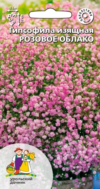 Гипсофила изящная Розовое облако - декоративное растение с эффектной серо-зеленой, ажурной листвой, достигающее 40-50 см в высоту. Растение украшают многочисленные мелкие цветки, собранные в легкие, изящные соцветия-метелки. Цветет обильно, но недолго, поэтому для продления декоративного эффекта рекомендуется проводить повторные посевы с интервалом 10-12 дней. Растение легко размножается самосевом. Гипсофила Розовое облако отлично подходит для создания цветовых акцентов и контрастов в различных ландшафтных композициях: на клумбах, рабатках и в качестве бордюрных растений.