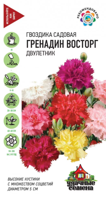 Популярное двулетнее травянистое растение для любительских цветников, формирует хорошо развитые кустики 40-60 см высотой. Стебли прямые, тонкие, коленчатые, облиственные. Листья узколинейные, прикорневые собраны в основании куста в розетку. Листья и стебли покрыты серебристо-сизым налетом. Цветки махровые, до 5 см в диаметре, расположены на концах побегов, самой разнообразной окраски, с тонким ароматом. Цветет обильно на второй год после посева с июля по август. Неприхотлива, холодостойка, предпочитает солнечные участки с легкой, плодородной, некислой почвой. На зиму молодые растения желательно укрыть лапником. Используют для всех видов цветников и качественной срезки, в воде гвоздика долго сохраняет декоративность.